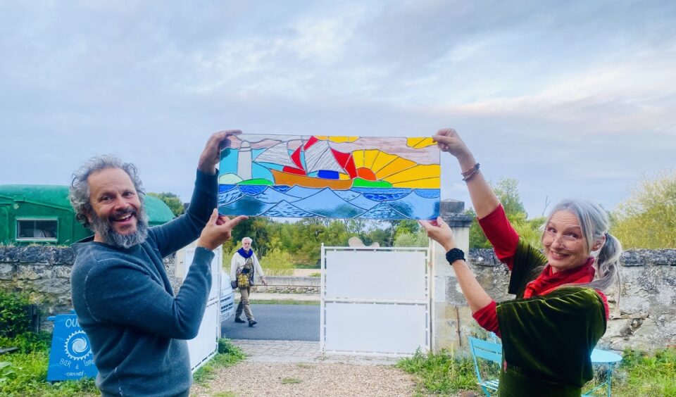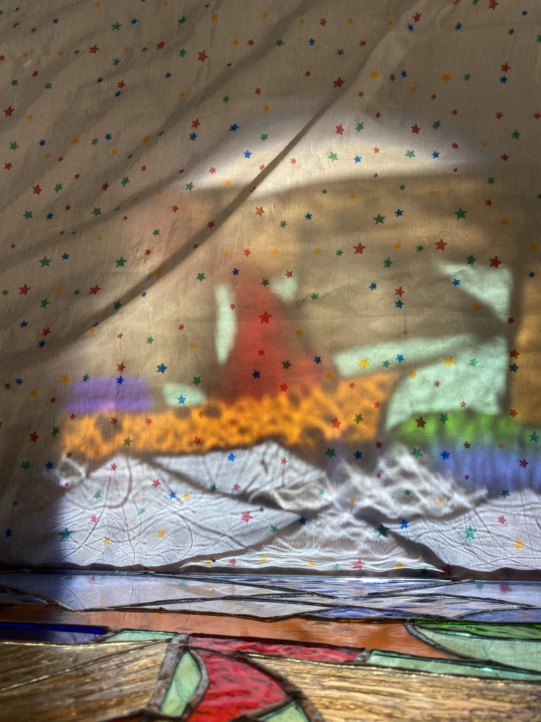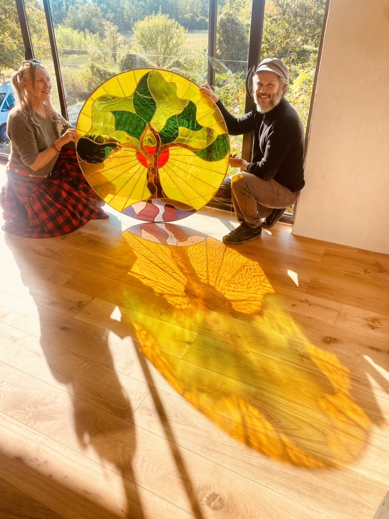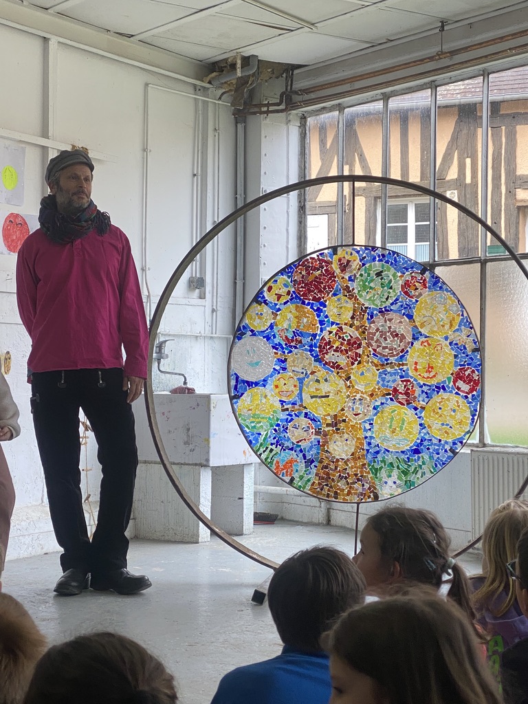 Puis se sont enchainés volontairement vitraux et concerts jusqu’à aujourd’hui… L’année 2025 elle, commença par 3 mois de résidence à https://www.lasourcegarouste.fr/ clairement mon asso préférée du monde entier! Elle accueille des artistes qui sont mis en lien avec des enfants issus d’environnement complexes et souvent perdus dans des déserts culturels. Benoît a fait de la mosaïque de verre et de la sculpture carton avec eux. Avec moi c’était ateliers respiration/clown de théâtre et rêves éveillés. Oui ces petiots ont tous infiniment besoin de réapprendre à se servir de leur créativité dans ce monde où tout est à moitié pré-mâché par les écrans, sans pour autant être bien digeste…