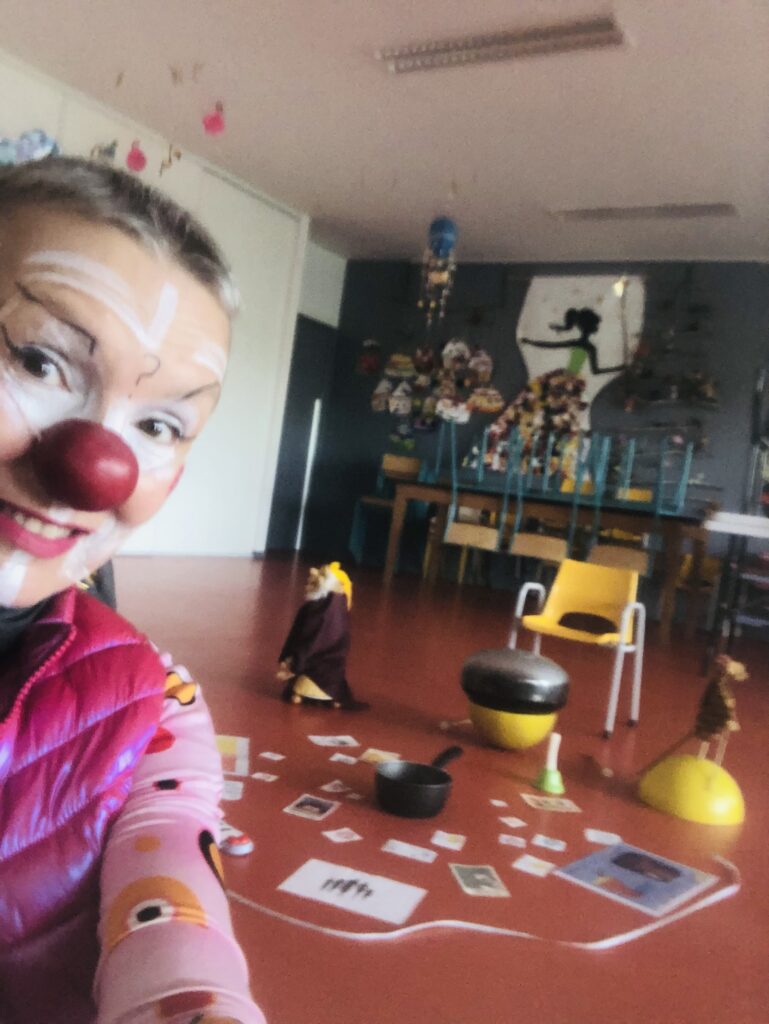 On a fabriqué une grande Mama en carton, ils ont chacun fait (entre autres) un œuf en mosaïque duquel, une fois rétro-projeté ils ont pu donner naissance à leur ravissant petit clown. J’ai eu le bonheur de composer une musique singulière pour chacun-e d’entre eux et ça donne ça :